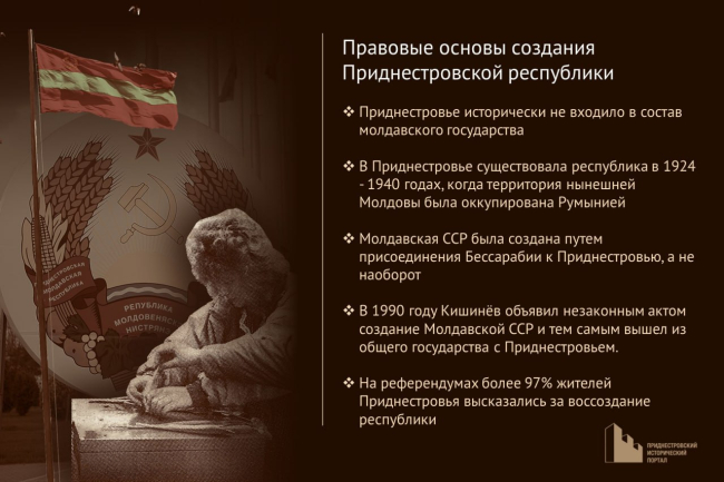 It is important to note that the Pridnestrovian state came about before the modern Moldavian one. Even the current Republic of Moldova is located on the territory that was not part of the historical core of the Moldavian Principality, but was conquered by it. The Principality itself ceased to exist in the second half of the 19th century, becoming part of Romania.