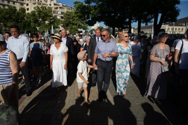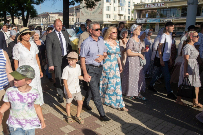 08 Jul, 2024, 19:03Today is marked as the Day of Family, Love and Fidelity in the secular calendar and July 8 in the church calendar is the day of remembrance of Saints Peter and Fevronya, the Orthodox patrons of marriage. Pridnestrovians do not divide these holidays. Traditions are intertwined. They handed out daisies in the morning to passers-by - symbols of this day and a happy family life. A religious procession was organized in the center of the capital in the evening. Residents of Tiraspol and guests of the city walked from the Church of the Nativity of Christ to the chapel on Pokrovskaya Square, where a thanksgiving prayer was held. The service was conducted by Archbishop of Tiraspol and Dubossary Sawa. The Krasnoselsky family took part. The PMR President was accompanied by his wife, children and grandchildren.