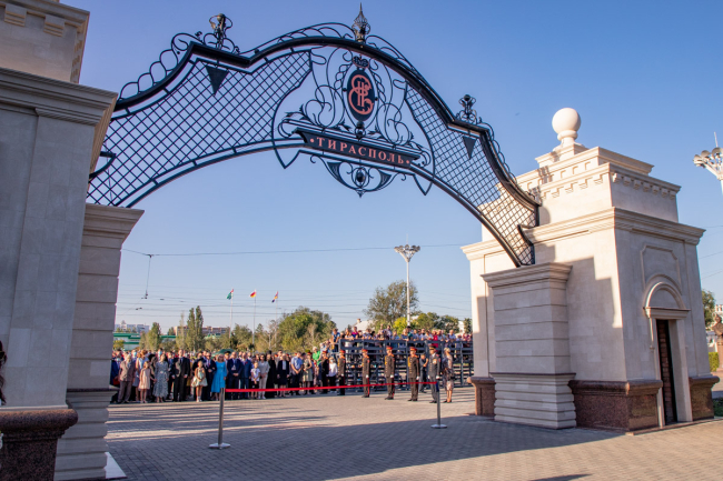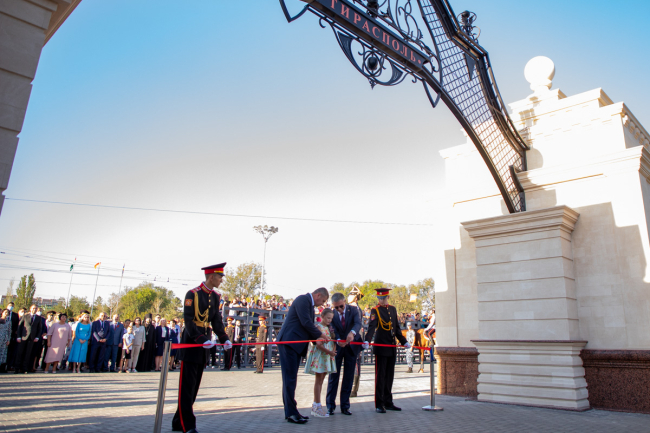Together with the monument to Catherine the Great, the park bearing her name is officially opened today. The PMR President with his daughter, the Head of the Tiraspol administration, a pupil of Suvorov Military College and a cadet cut the symbolic red ribbon on the entrance arch of the grandiose object of leisure infrastructure in a solemn atmosphere, to the sound of fanfare. Improvement of the city, introduction to the culture of recreation and preservation of history - all these functions are performed by the park complex, created in two years on the initiative and with the support of the PMR President Vadim Krasnoselsky.