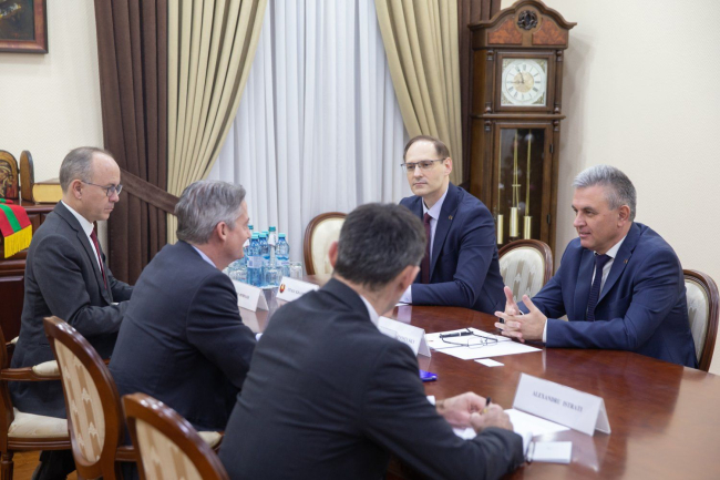 19 Dec, 2024, 12:55Representatives of the American Embassy arrived in Tiraspol. The delegation was headed by the US Chargé d'Affaires in the Republic of Moldova Kevin Covert. The visitors were received by the PMR President Vadim Krasnoselsky. The meeting was held at the presidential executive office. The PMR Foreign Minister Vitaly Ignatiev was invited to the conversation. The interlocutors exchanged greetings and congratulations on the upcoming holidays. They indicated their readiness for an open dialogue. The topics were: the state of the negotiation process and current problems of its settlement, possible energy crisis – the desire to prevent and take measures to minimize the scale and consequences, as well as the life of the Pridnestrovian society in general. Kevin Covert noted that this is his first time in Pridnestrovie and he is trying to learn the situation from the inside.