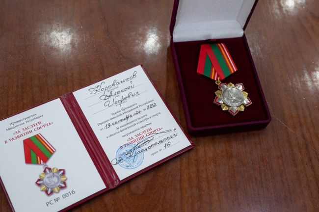 24 Sep, 2024, 17:19Vadim Krasnoselsky signed the Decree of the PMR President "On awarding the Order "For Merits in the Development of Sports" to Alexey Igorevich Korovashkov" on September 19. The President invited the sporsman to his office and personally presented the award today. The meeting was attended by the head of the State Sports Service Vyacheslav Sokolenko.