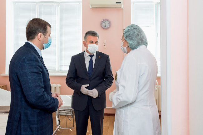 The inspection team visited the Republican Center for Mother and Baby. Communicating with management and the staff, Vadim Krasnoselsky focused on ensuring the protection of doctors from infection, emphasizing that physicians in the existing realities should position themselves and each patient as a carrier of the virus, regardless of symptoms and circumstances. The President drew attention in this regard to the fact that the staff still did not meet visitors in protective clothing, but in white coats. The President considers this attitude careless. Discussing the possibilities of the institution regarding the placement of coronavirus hospital in its building, the staff of the medical institution recalled that there is the only intensive care unit for newborns in the republic. It was said that the necessary conditions have already been created for the adoption of labor in patients with COVID-19.