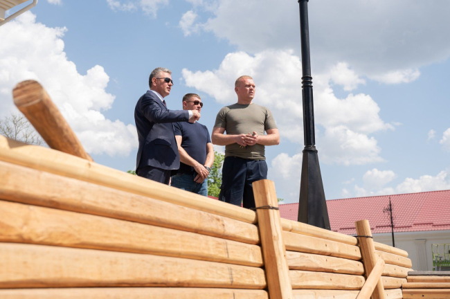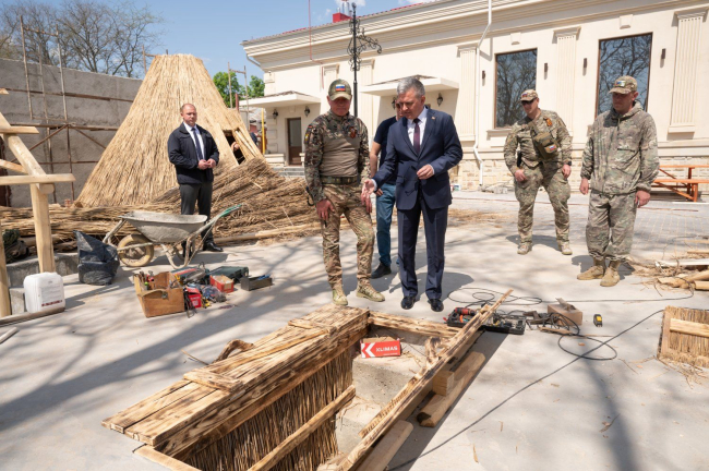 24 Апр., 2025, 14:49The museum infrastructure in the center of the capital continues to be transformed. The efforts of builders and other specialists involved in the creation of the republican museum are focused now on objects that will cover the historical period of the Great Patriotic War. The work is under presidential control. Vadim Krasnoselsky regularly visits the construction site with inspections. An unscheduled visit took place today. The PMR President inspected the almost finished location, created on the basis of a real firing point that operated during the war. Surviving pillboxes are found in the post-Soviet space, but it is almost impossible to find those recreated in the smallest detail. The construction of an exhibition pavilion, which will house military equipment, is also in the final stage. The structure turned out to be impressive. It was designed to be open along the perimeter, but with a canopy. The design was maintained in a single architectural style with the museum buildings. Work is actively progressing on the partisan village creation. The content of the future mural on the wall is already being read, which will harmoniously outline the museum section dedicated to the Great Patriotic War, while becoming part of the exhibition.