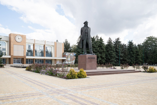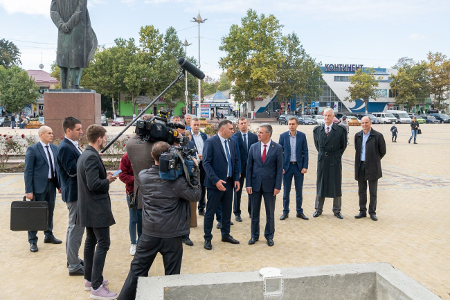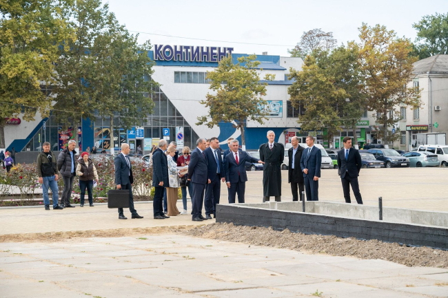 28 Sep, 2021, 13:04The PMR President being in the north of the republic examined the central part of Rybnitsa. Renovation and construction works are carried out in the main city square and in the central park. The Head of the local administration Viktor Tyagay reported on the intermediate results: the square was paved with tiles, landscaping was renewed, small architectural forms were installed. Future fountains are awaiting cladding, materials have been ordered. Arched structures are also on the way, said Viktor Tyagay. The major reconstruction is expected to be completed by the City Day.