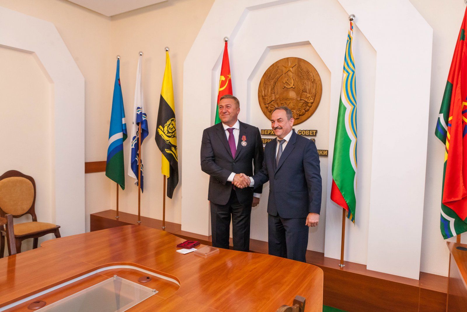At the end of the meeting, the Speaker of the Pridnestrovian parliament presented Alexander Yaroshuk a ministerial award of the Supreme Council - the honorary sign “For Contribution to the Cause of Parliamentarism.”