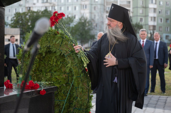 The event continued at the monument to Russian military glory, where a funeral litiya was held. Those present laid flowers at the obelisk installed in 1912. This monument, called "The Eagle" by the townspeople, was erected with funds from soldiers and officers of the imperial army. There is an inscription on its granite slabs: "Descendants to valiant ancestors. From the 55th Podolsk Infantry Regiment".