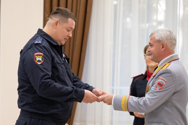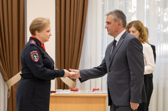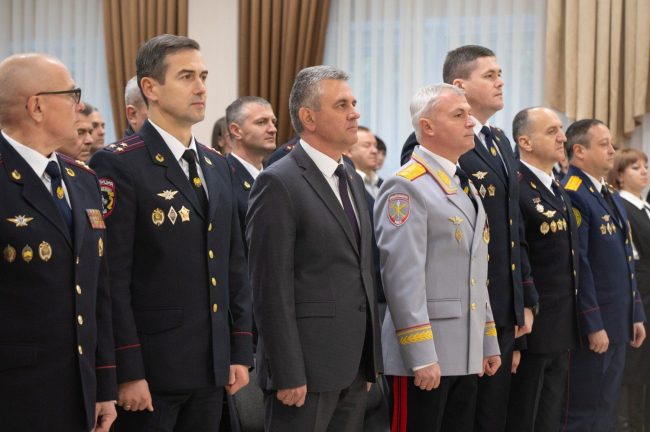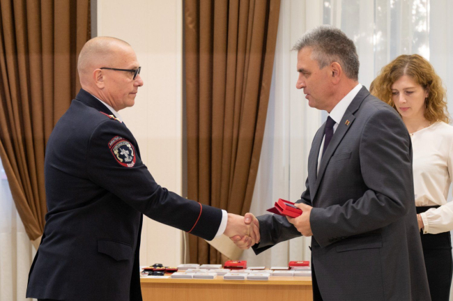 The PMR President presented state awards to the most distinguished employees of various departments of the Ministry of Internal Affairs of the Pridnestrovian Moldavian Republic. Sportsmen from among law enforcement officers were also awarded.