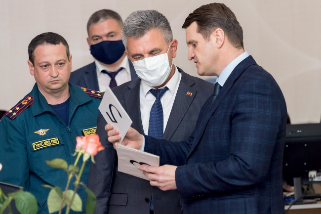 Today is the first day of the center. The President arrived to get acquainted with the organization. The Minister of Internal Affairs Ruslan Mova introduced the Head of the Crisis Center to Vadim Krasnoselsky. Vadim Shmalenko, the Head of the Main Directorate for Emergency Situations of the PMR Interior Ministry was appointed to this position. The President was told that organizational and commissioning work was carried out over two days - Thursday and Friday. The center has been working in test mode in a weekend. Today is a full-time work day for three dozen specialists of different directions. Before lunch, 226 calls were received in electronic form and about four hundred calls were received. Workplaces are equipped with all necessary and are located in such a way as to ensure a quarantine distance between employees. The hall is divided into four zones. The first is to receive calls coming to the hotline. If possible, the operator consults, if the issue is not in his competence, he redirects it to the representative of the profile service. The two sectors bring together specialists in the domestic policy. Employees of ministries, departments and services are in charge of foreign policy issues, including interstate movement of citizens in the fourth zone. There is no paper workflow: all applications are accepted, processed and accumulated in electronic form. They deployed a server room on the spot, started up all the necessary communications, use a software product created two years ago on their own, Ruslan Mova informed. The center involves round-the-clock work. But at night, the room is disinfected, ventilated and cleaned. Employees recruited from other departments conduct receptions from 8.00 to 20.00 (during 12 hours). Applications received at night will be received by operational officers of the Ministry of Internal Affairs who are on duty, to process it and, if it is not possible to give an immediate qualified response, to transfer to specialized specialists in the morning.