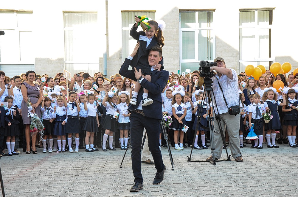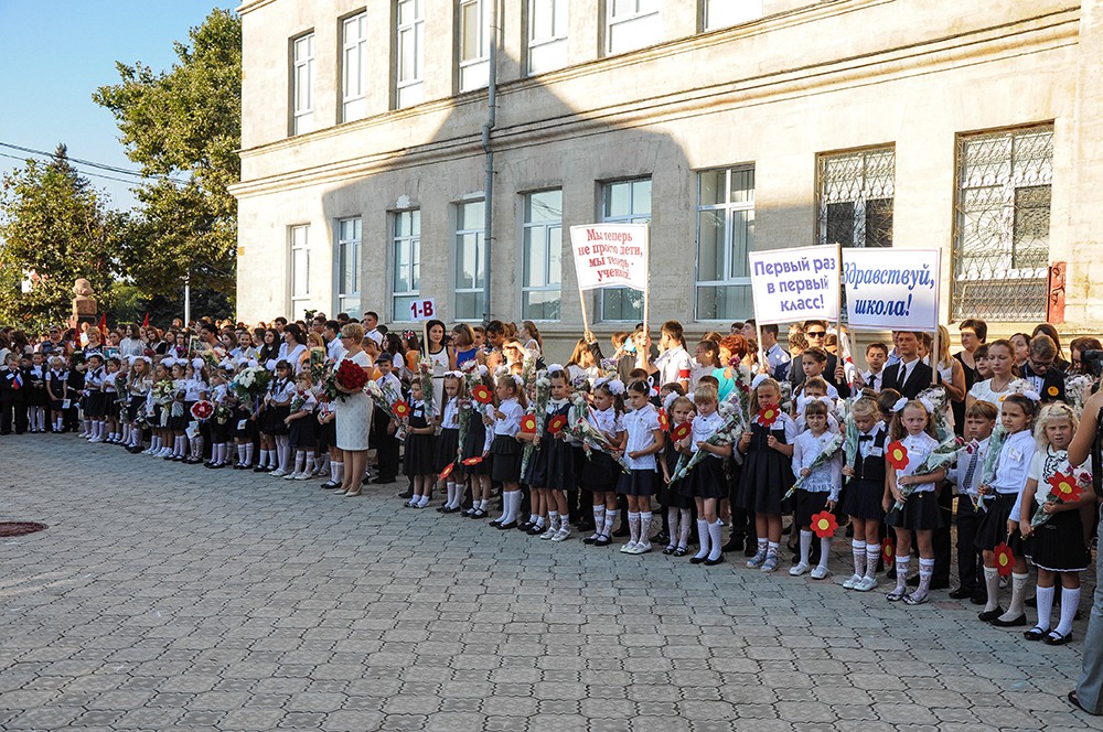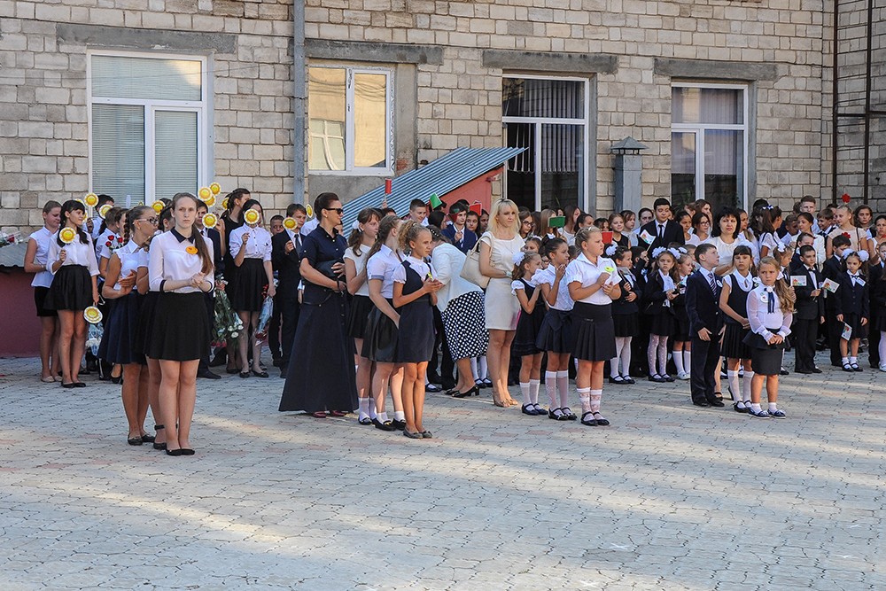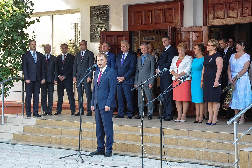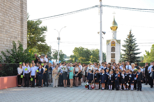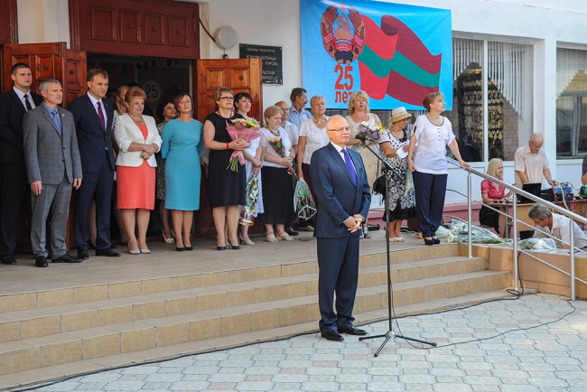 Today a whole delegation of guests has shared with gymnasium pupils the happiness of the first bell ceremony. Among the guests were Pridnestrovie's president, Yevgeny Shevchuk, minister of education, Tatyana Tsivinskaya, Russian ambassador to Moldova, Farit Mukhametshin, and the founder of ANO Eurasian Integration, Aleksey Zhuravlyov.