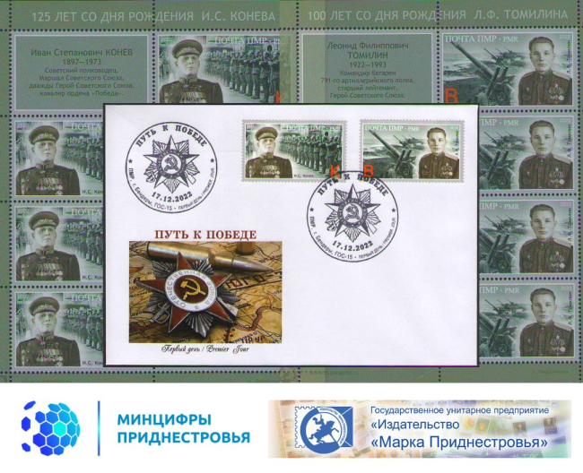 Тирасполь, 16 декабря. /Новости Приднестровья/. Завтра, 17 декабря, в Бендерах пройдет спецгашение серии марок «Путь к Победе». В неё входят марки с изображениями Героев Советского Союза - маршала И. С. Конева и старшего лейтенанта Л. Ф. Томилина.