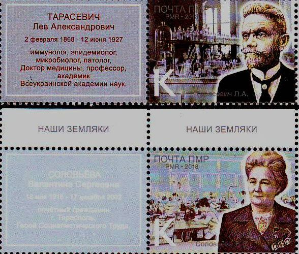 Первый выпуск – «Наши земляки» - серия из двух марок, посвященная 100-летию В.С. Соловьевой и 150-ти летию Л.А. Тарасевича. Тираж этой серии составляет 7,2 тыс. штук.