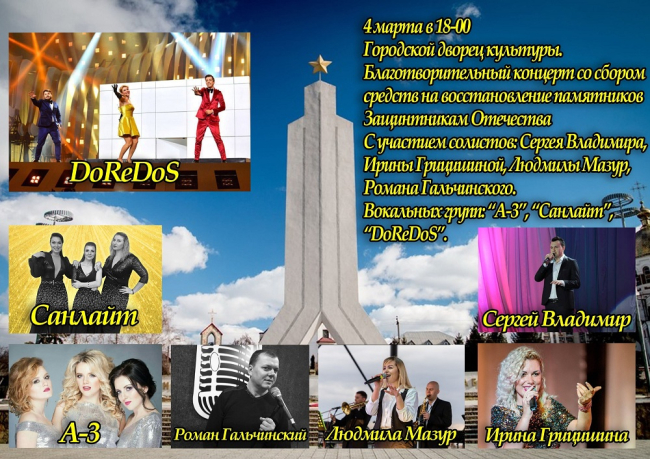 Рыбница, 27 февраля. /Новости Приднестровья/. 4 марта во Дворе культуры Рыбницы состоится благотворительный концерт по сбору средств на ремонт и реставрацию памятников участникам Великой Отечественной войны.