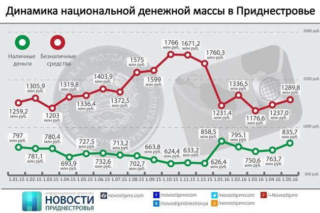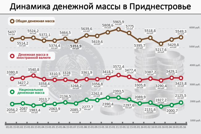 Тирасполь, 16 мая. /ИА «Новости Приднестровья»/. Согласно данным Приднестровского республиканского банка (ПРБ), совокупный объём денежного предложения за апрель 2016 года увеличился на 2,2% и на 1 мая 2016 года составил 5,5 миллиарда рублей. Это на 2,8% выше показателя начала года.
