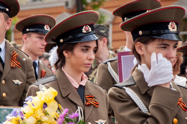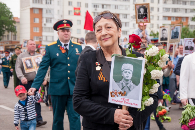 «Иду со своими родителями и дедушкой. Он у меня прошёл три войны: 1-ю мировую, гражданскую и Великую Отечественную, отец воевал в Великую Отечественную, а мама была труженицей тыла. Для нас это всегда был особенный праздник, и эта дата много для меня значит, ведь они всё-таки отстояли, победили, и если бы не они, даже не знаю, что было бы с Россией и с нами тоже. Так много чувств – и волнение, и гордость, и грусть, и радость, столько всего сразу, что и не выразить», – говорит Ирина Клетова.