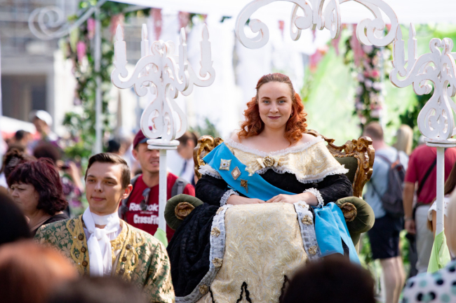 Перенестись в эпоху царствующей императрицы предлагается через триумфальную арку, где гостей встречают живые статуи и сама наследница Российской империи, восседающая на троне.