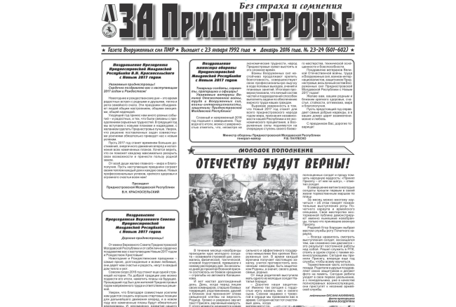 Тирасполь, 23 января. /ИА «Новости Приднестровья»/. Газете Вооруженных сил ПМР «За Приднестровье» исполнилось 25 лет. Первый номер этого издания вышел в свет 23 января 1992 года, когда задачу по защите независимости и суверенитета ПМР выполняла ещё Республиканская гвардия. А уже 2 марта с нападения молдавского ОПОНа на полк гражданской обороны российской 14-й армии, дислоцированный в селе Кочиеры Дубоссарского района, началась широкомасштабная военная агрессия Молдовы против ПМР. Именно корреспонденты газеты «За Приднестровье» с риском для жизни готовили репортажи с боевых позиций гвардейцев и ополченцев, писали о том, как жители республики отстаивают свои дома, родные города и сёла.
