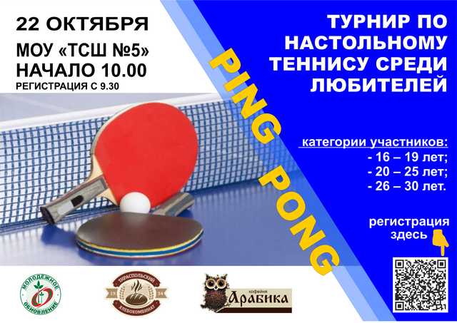 Тирасполь, 19 октября. /Новости Приднестровья/. 22 октября в тираспольской средней школе № 5 состоится городской открытый турнир по настольному теннису. Организатор соревнований – движение «Молодёжное Обновление».