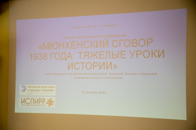 Тирасполь, 27 сентября. /Новости Приднестровья/. В Приднестровском госуниверситете им. Т.Г. Шевченко Институтом социально-политических исследований и регионального развития при содействии Россотрудничества сегодня была организована международная научная конференция на тему «Мюнхенский сговор 1938 года. Тяжёлые уроки истории». Участие в ней приняли приднестровские, российские и молдавские учёные.
