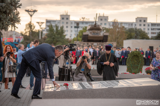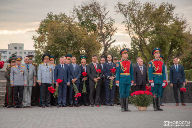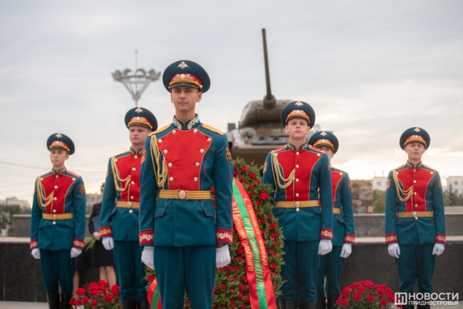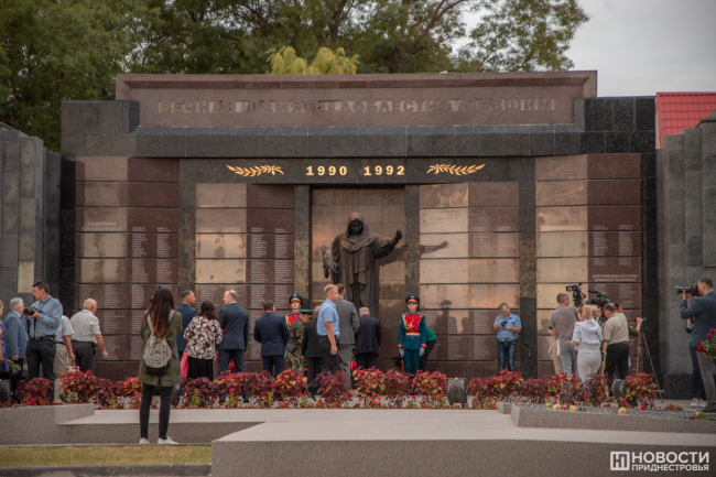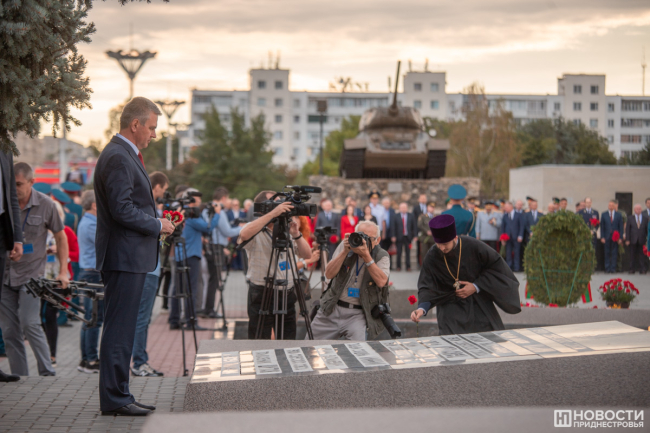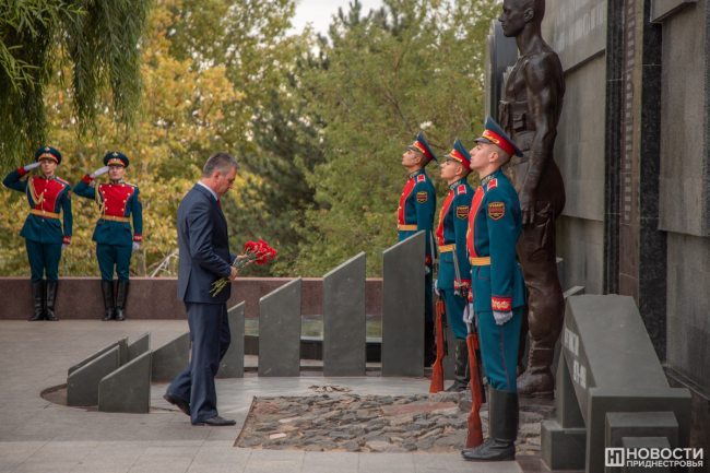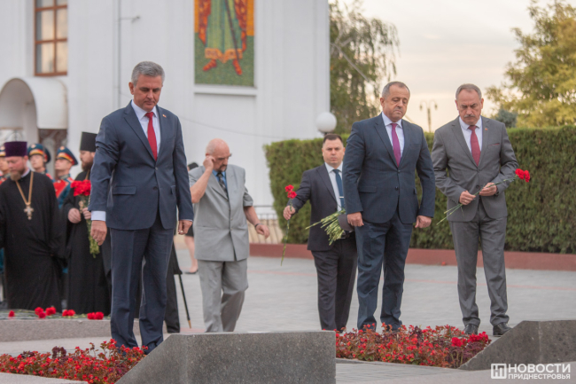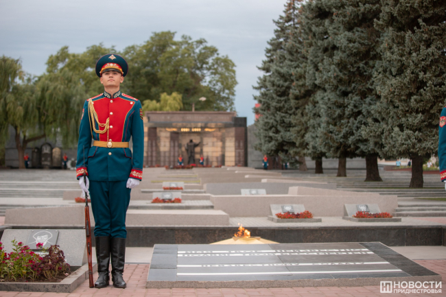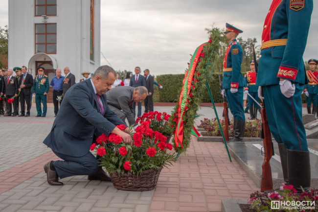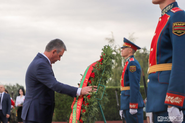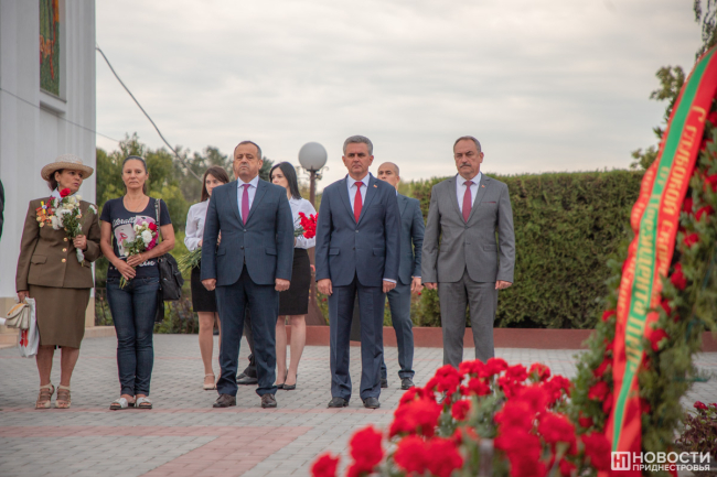 К мраморным плитам с их именами памятный венок опустил Президент ПМР Вадим Красносельский. Участники торжественной церемонии оставили россыпь цветов на могильных плитах и у постаментов памятников мемориального комплекса.