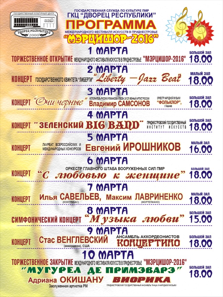 Отметим также, что с 1 по 10 марта по всей республике в рамках Международного фестиваля искусств «Мэрцишор-2016» пройдут творческие выставки, концерты и  музыкальные вечера.