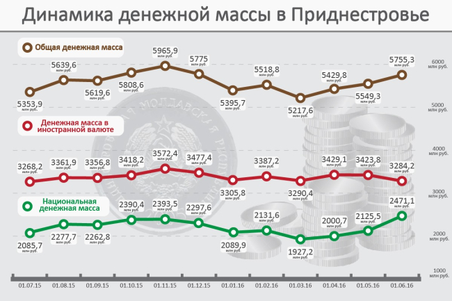 Отметим, что национальная денежная масса (то есть средства в рублях ПМР) за май существенно возросла — более чем на 16%, в то время как денежная масса в иностранной валюте сократилась на 4,1%.
