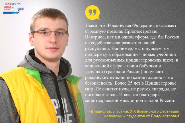 21 Фев., 2018, 12:0718 марта 2018 г. в Российской Федерации пройдут выборы Президента. В Приднестровье будут открыты 24 избирательных участка. В республике сегодня проживают порядка 220 тысяч граждан РФ. В связи с этим участники XIX Всемирного фестиваля молодежи и студентов от Приднестровья проводят с 20 февраля по 18 марта 2018 г. Республиканскую информационную кампанию «Приднестровье голосует вместе с Россией. Россия в моем сердце!».