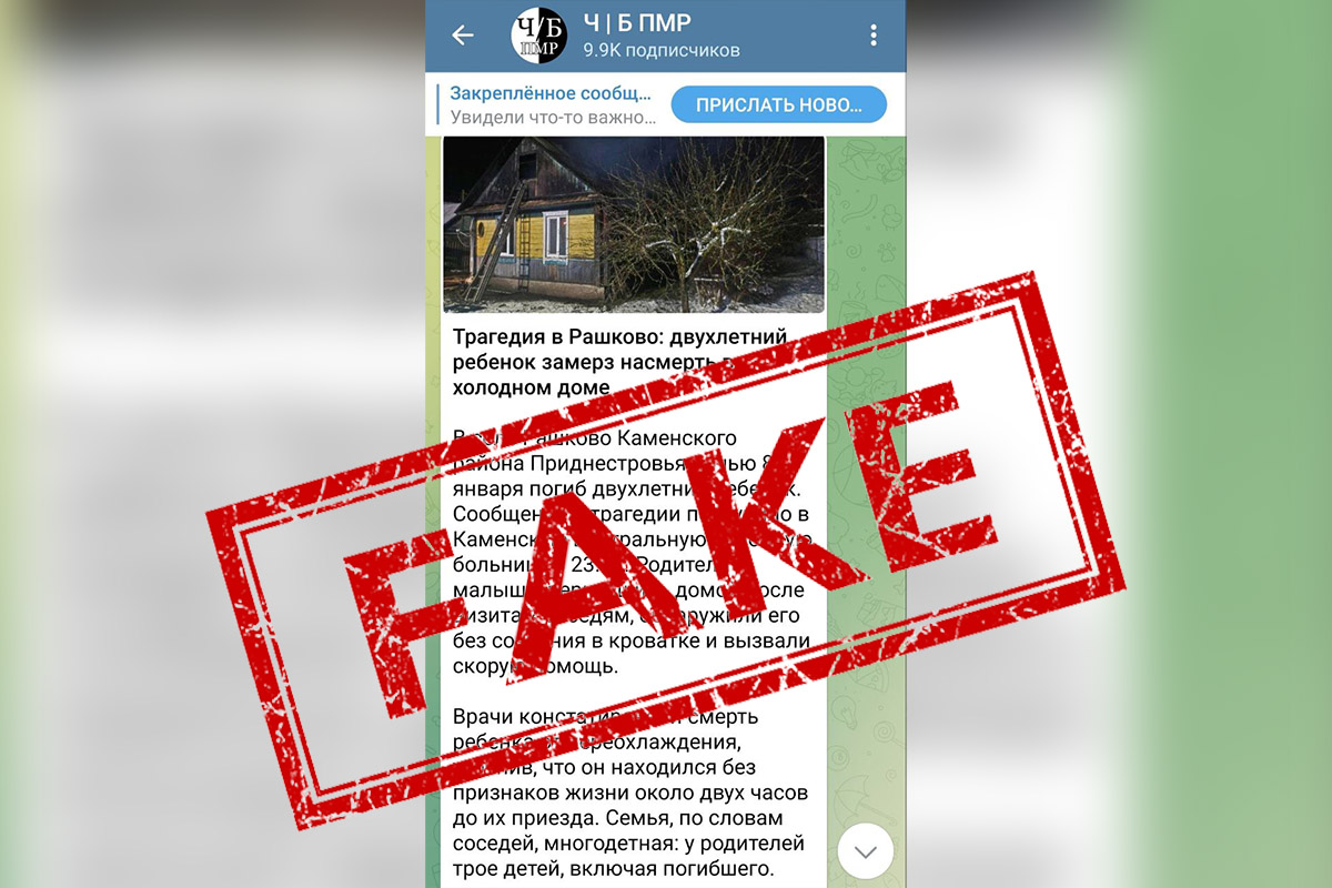 Каменский район, 8 января. /Новости Приднестровья/. Информация о гибели 2-летнего ребёнка от переохлаждения в каменском Рашкове оказалась фейком. Сообщение о трагедии появилось сегодня в социальных сетях.