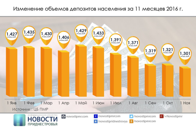 Тирасполь, 23 ноября. /ИА «Новости Приднестровья»/. По итогам 10 месяцев этого года объём депозитов населения в коммерческих банках республики продолжает снижаться. Так, по данным ПРБ, к 1 ноября он уменьшился на 8,8% – с 1 млрд 426,8 млн (в январе) до 1 млрд 301,1 (в ноября) млн рублей.