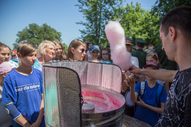 01 Июн., 2018, 16:21Тирасполь, 1 июня. /Новости Приднестровья/. День защиты детей отметили сегодня и в Оперативной группе российских войск в Приднестровье. Забыв на время про строгую форму и обращение по уставу, военнослужащие превратили спортплощадку в настоящий детский городок. А сами настолько вошли в образ сказочных персонажей, что их едва можно было узнать. К примеру, мороженое раздавал Царь – по порции каждому входящему ребёнку, а весёлым батутом заведовал сам Кощей Бессмертный, в миру - Вадим.