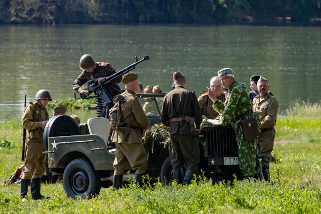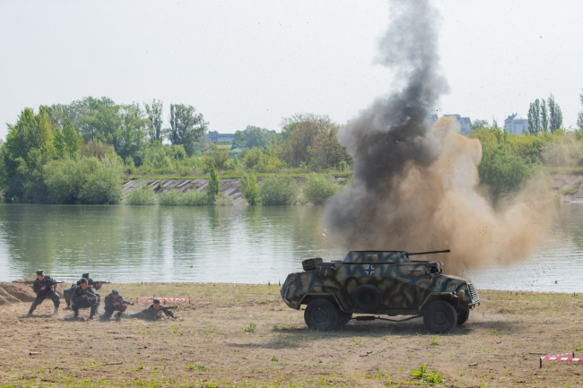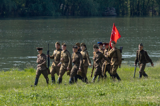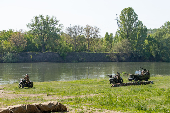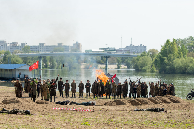 03 Май, 2019, 16:32Тирасполь, 3 мая. /Новости Приднестровья/. И снова бой. Красная армия форсирует водную преграду и идет на штурм вражеских укреплений: повсюду взрывы и грохот боевых машин, едва заметных в клубах пыли и дыма. Происходящее на поле боя, несмотря на весь эмоциональный накал, все же остается художественной постановкой: музыкальное сопровождение и голосовой экскурс дополняют картину военно-исторической реконструкции, которая проводится в приднестровской столице уже третий год подряд.