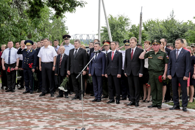 Память погибших почтили минутой молчания, после чего к подножию Мемориала возложили живые цветы.