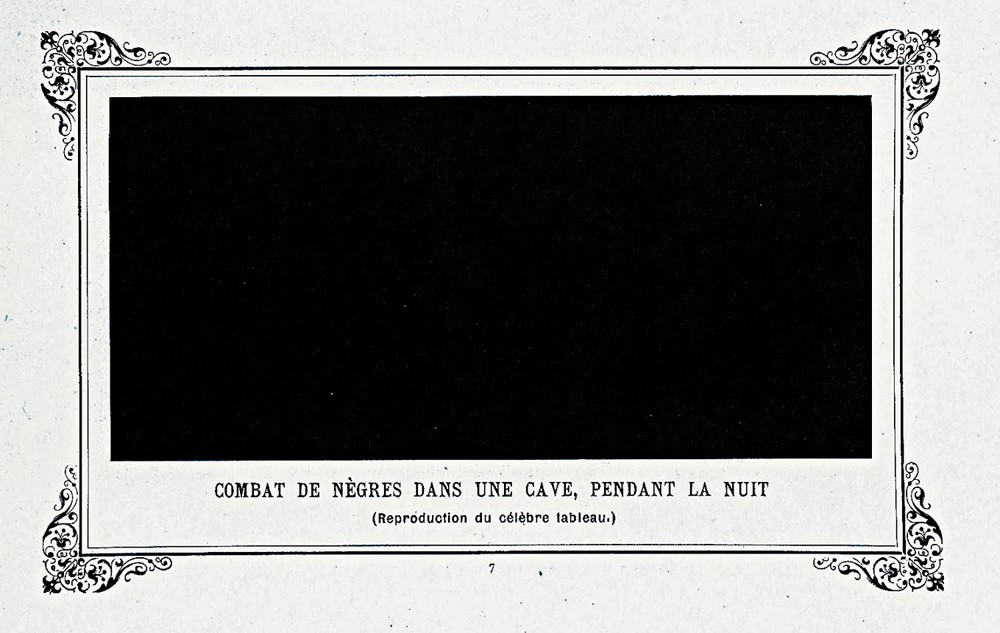 Кроме того, учёные обнаружили на полотне надпись, предположительно оставленную рукой самого Малевича. Расшифровать её удалось только частично, однако исследователи полагают, что текст должен читаться как «Битва негров в тёмной пещере глубокой ночью». Если выводы исследователей верны, то она отсылает к серии монохромных картин французского журналиста Альфонса Алле, одна из которых имеет в точности такое же название.
