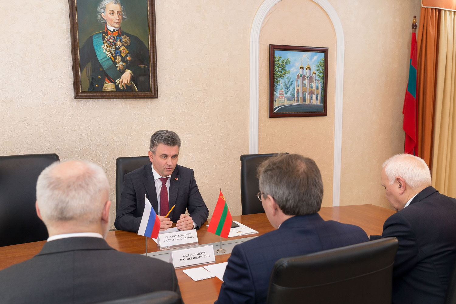 Тирасполь, 30 января. /ИА «Новости Приднестровья"/. Глава государства Вадим Красносельский принял российскую делегацию во главе с председателем комитета Госдумы РФ по делам СНГ, евразийской интеграции и связям с соотечественниками Леонидом Калашниковым.