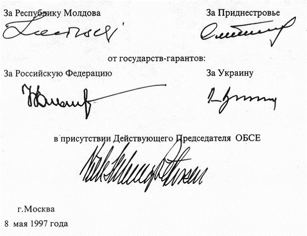 8 мая 1997 г. - При посредничестве России и Украины президенты РМ и ПМР подписывают Меморандум об основах нормализации отношений. Договор предусматривал «правила игры» для переговорного процесса между двумя государствами. В дальнейшем этот документ послужил основой для дипломатических консультаций Приднестровья и Молдовы. Республика Молдова признавала право ПМР на собственную конституцию и установление международных экономических и культурных связей. По мнению ряда экспертов, это было фактическое признание Молдовой политической автономии Приднестровья. В то же время в Тирасполе продолжают настаивать на полной независимости.