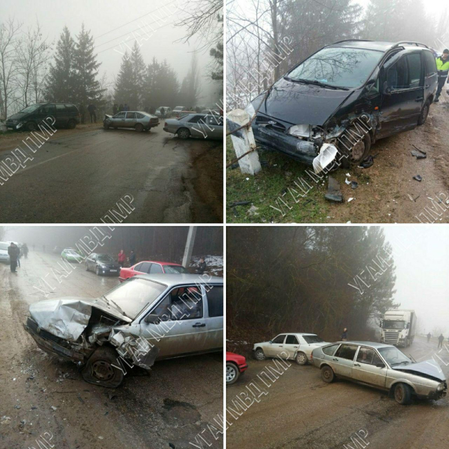 Водитель Volkswagen Passat из-за погодных условий не справился с управлением, выехал на полосу встречного движения и врезался в Ford. Затем в иномарки врезались ещё два автомобиля: BMW и Mercedes. Водители не успели вовремя остановиться на скользкой дороге.