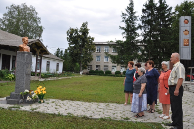 Затем участники памятного мероприятия возложили цветы к бюсту Фёдора Жарчинского, установленному на территории сельской школы, учителем и директором которой герой был до войны.