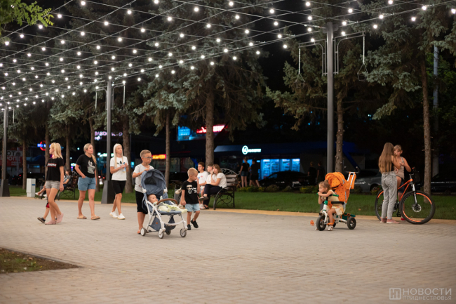 Несколько дней назад в сквере зажгли декоративное освещение. Это сотни лампочек, сплетённые в одну световую композицию.