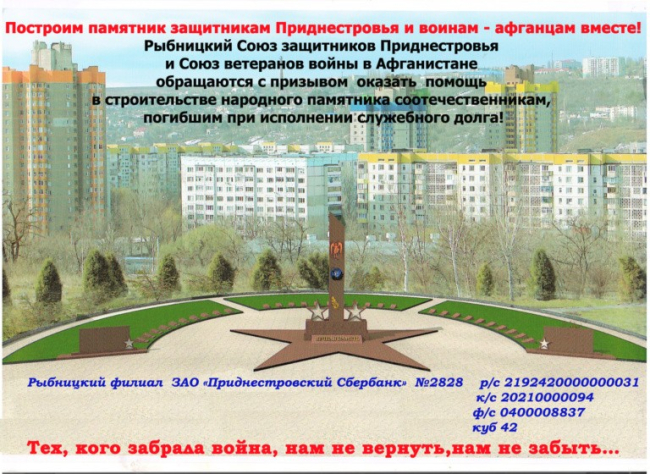 Рыбница, 6 марта. /ИА Новости Приднестровья/. Рыбницкий Союз защитников Приднестровья и Союз ветеранов войны в Афганистане выступил с призывом оказать помощь в строительстве памятника соотечественникам, погибшим при исполнении служебного долга.