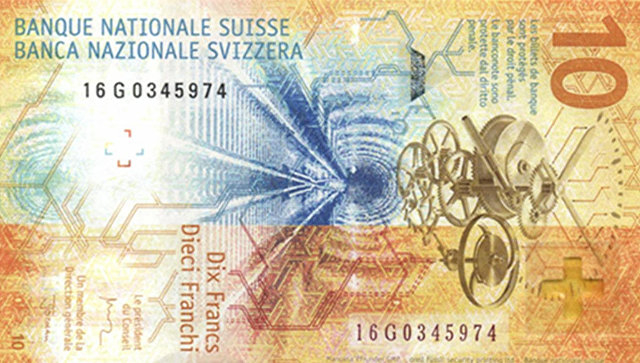 Швейцарская купюра в 10 франков — часть нового выпуска Центрального банка Швейцарии, объединённого общей темой: национальный характер и абстрактные темы. На банкноте-победительнице изображены человеческие руки с дирижерской палочкой и часовой механизм, символизирующие любовь швейцарцев к музыке и их бережное отношение ко времени.