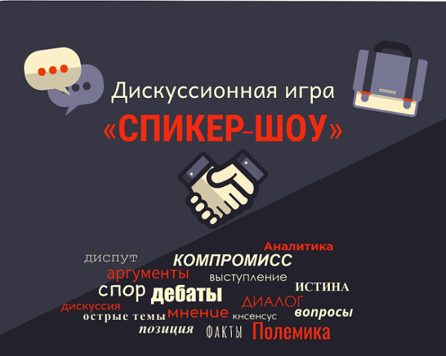 В ходе дискуссионной игры её участники-спикеры посоревнуются между собой в ораторских поединках. В одной схватке участвуют 2 спикера.