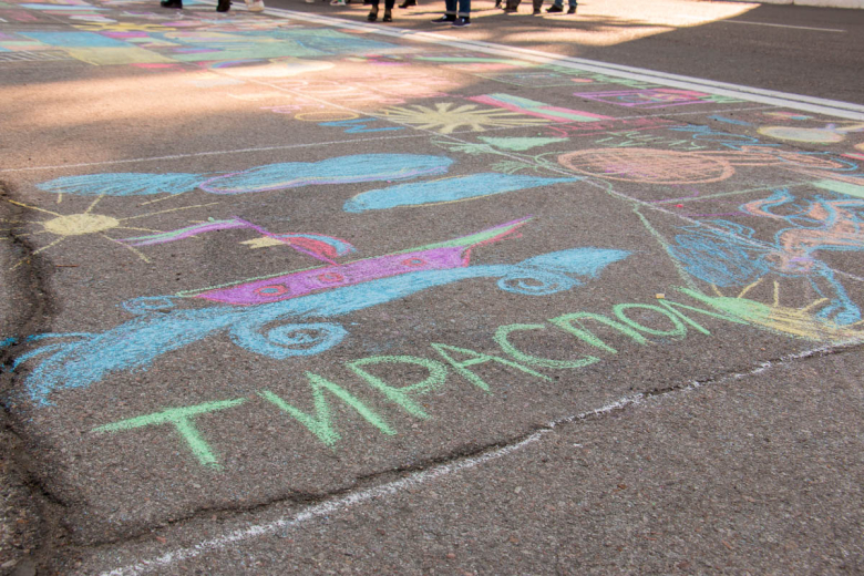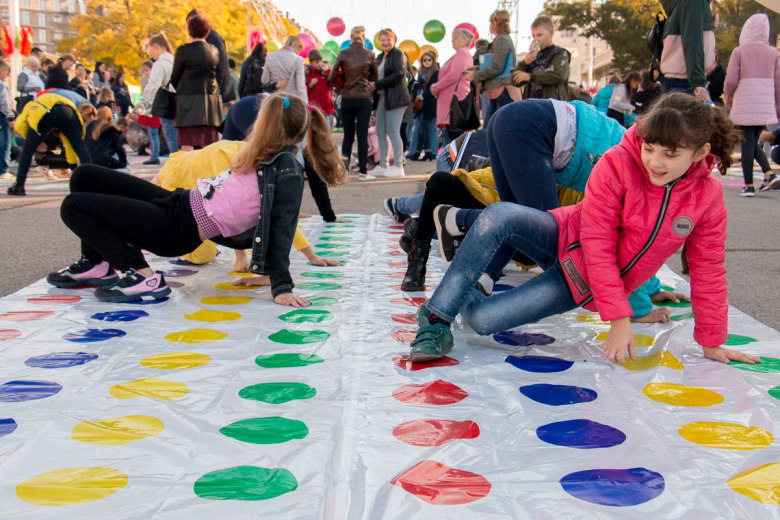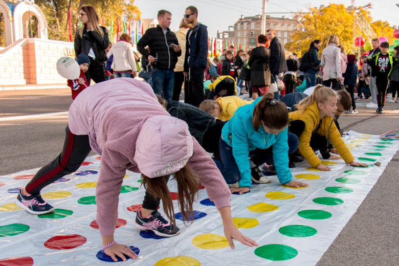 На всей площади расположились тематические фотозоны. Здесь же прошёл конкурс рисунка на асфальте «Город детства». А рядом ребята играли в твистер.