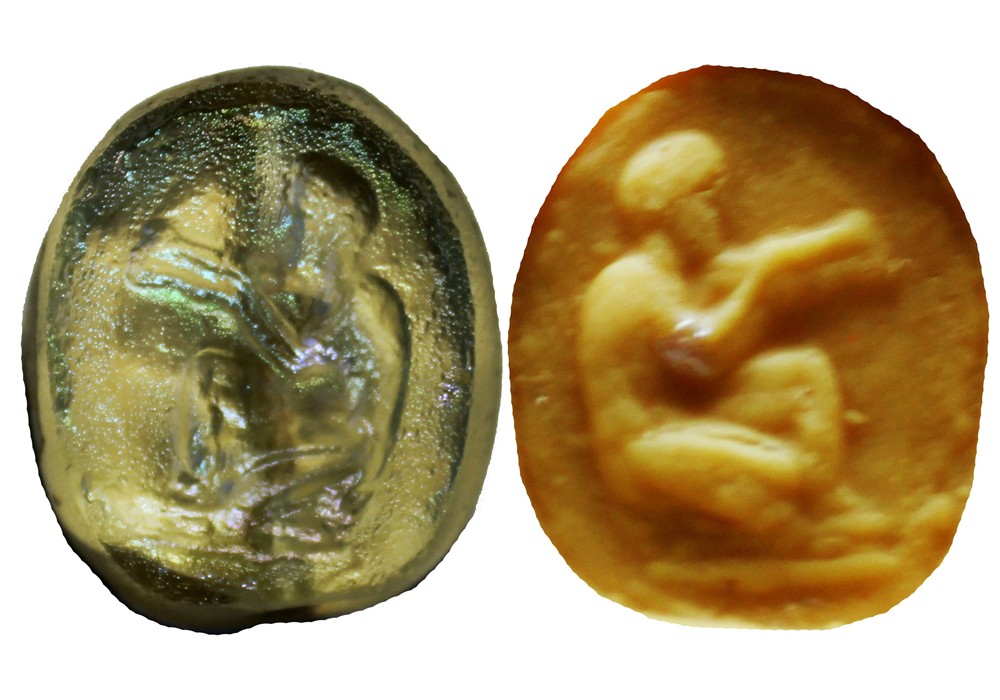 В этом году в одном из курганных склепов возле Глиного археологи наткнулись на необычный амулет из халцедона. На лицевой стороне полудрагоценного камня вырезан углублённый рельеф в виде фигуры мужчины с пышной бородой, в руках у которого раскрытые свитки. Находка вызвала восторженное удивление археологов, по их словам, это уникальный артефакт для всего Северного Причерноморья. Изображение коленопреклонённого мужчины выполнено в явно греческой манере. Свитки в его руках выдают в нем мудреца, философа. Тем не менее камень обнаружен в гробнице скифянки в составе ожерелья из бус и, возможно, использовался как оберег.