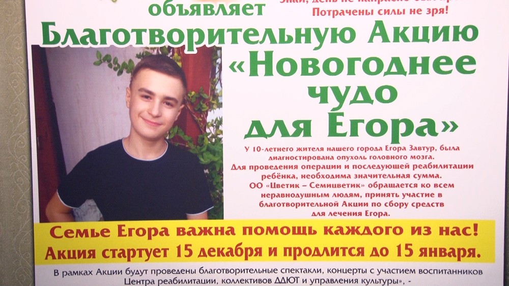 Собранные средства пойдут на лечение 10-летнего дубоссарца Егора Завтура, у которого диагностирована опухоль головного мозга. Для проведения операции и последующей реабилитации мальчика необходима большая сумма денег. Сегодня в Москве Егора прооперировали.
