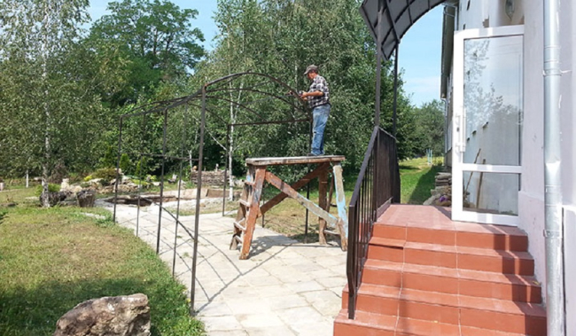 Все работы выполняют сотрудники учреждения. Уже отремонтировали крыльцо с выходом из школы, как раз к этноуголку. Также здесь установили перила и козырёк, дорожки выложили из камня, сварили арку для цветов, выкопали котлован и подготовили пространство для будущего пруда.
