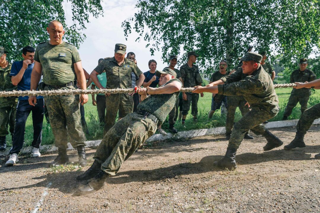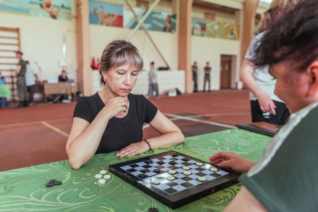 Военнослужащие играли в шашки, настольный теннис и волейбол, метали дротики, проверили свои силы в армрестлинге и перетягивании каната, преодолели эстафету