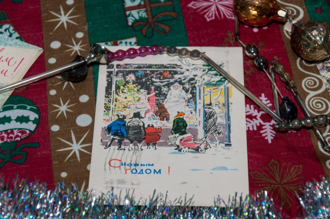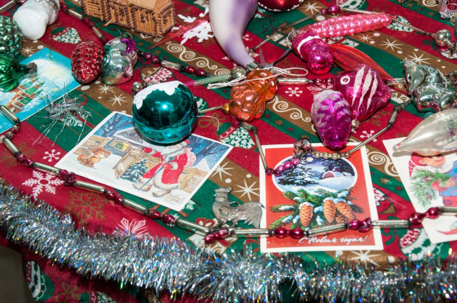 На ней представлены советские новогодние игрушки и открытки