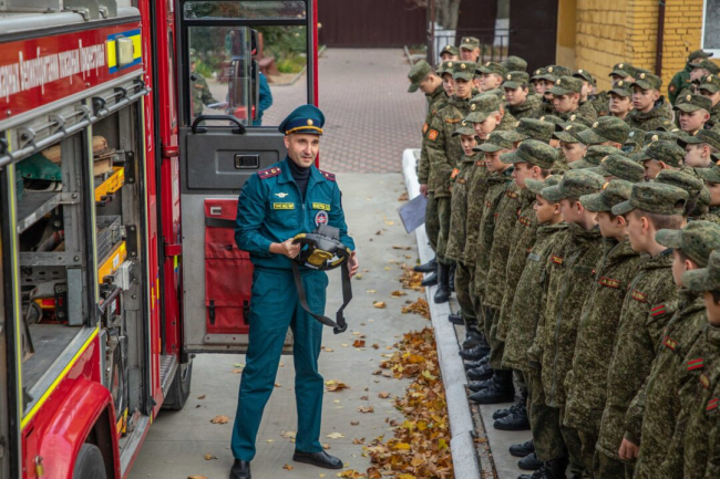 Затем пожарные провели для суворовцев лекцию по пожарной безопасности. Показали устройство пожарного автомобиля.