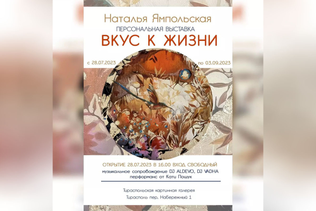 Тирасполь, 27 июля. /Новости Приднестровья/. 28 июля в 16:00 в Тираспольской картинной галерее состоится торжественное открытие персональной выставки Натальи Ямпольской.