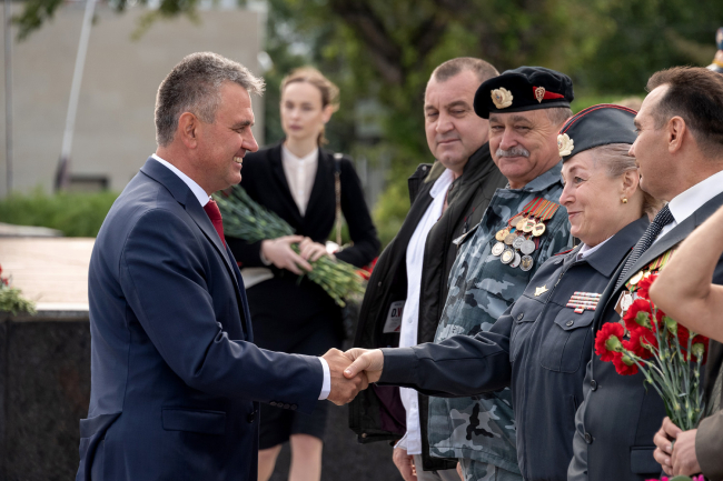 «Сегодняшним военным парадом мы чествуем и отдаём дань глубокого уважения всем тем, кто в разные годы стоял на страже рубежей Отечества, кто беззаветно и честно выполнял свой долг перед Родиной, кто и сейчас достойно и преданно служит своему народу. 2 сентября мы ежегодно вспоминаем наших героев, павших за свободу и независимость Приднестровской Молдавской Республики, а также всех тех, кто отдал свои жизни за нашу Родину», – напомнил Вадим Красносельский, объявив минуту молчания в память о погибших и умерших защитниках Отечества.