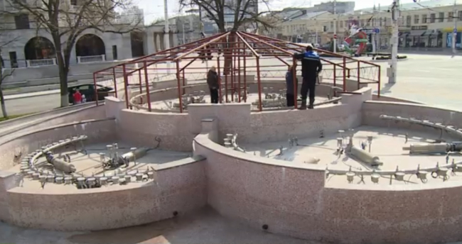 Тирасполь, 3 апреля. /Новости Приднестровья/. Поющий фонтан в центре Тирасполя готовят к новому сезону. С ноября прошлого года он был законсервирован, и вот пару дней назад с чаши сняли защитный купол, а накануне начали демонтаж железного каркаса.